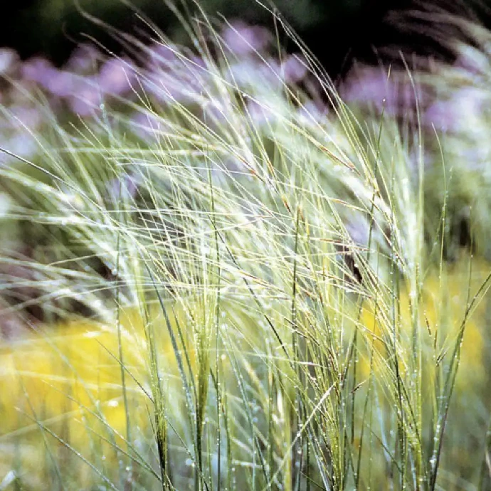 Le Stipa capillata apporte du mouvement avec ses fines tiges souples qui captent la lumière. La Salvia Felina structure l’ensemble grâce à sa floraison dense et à ses tons profonds, créant un contraste élégant.