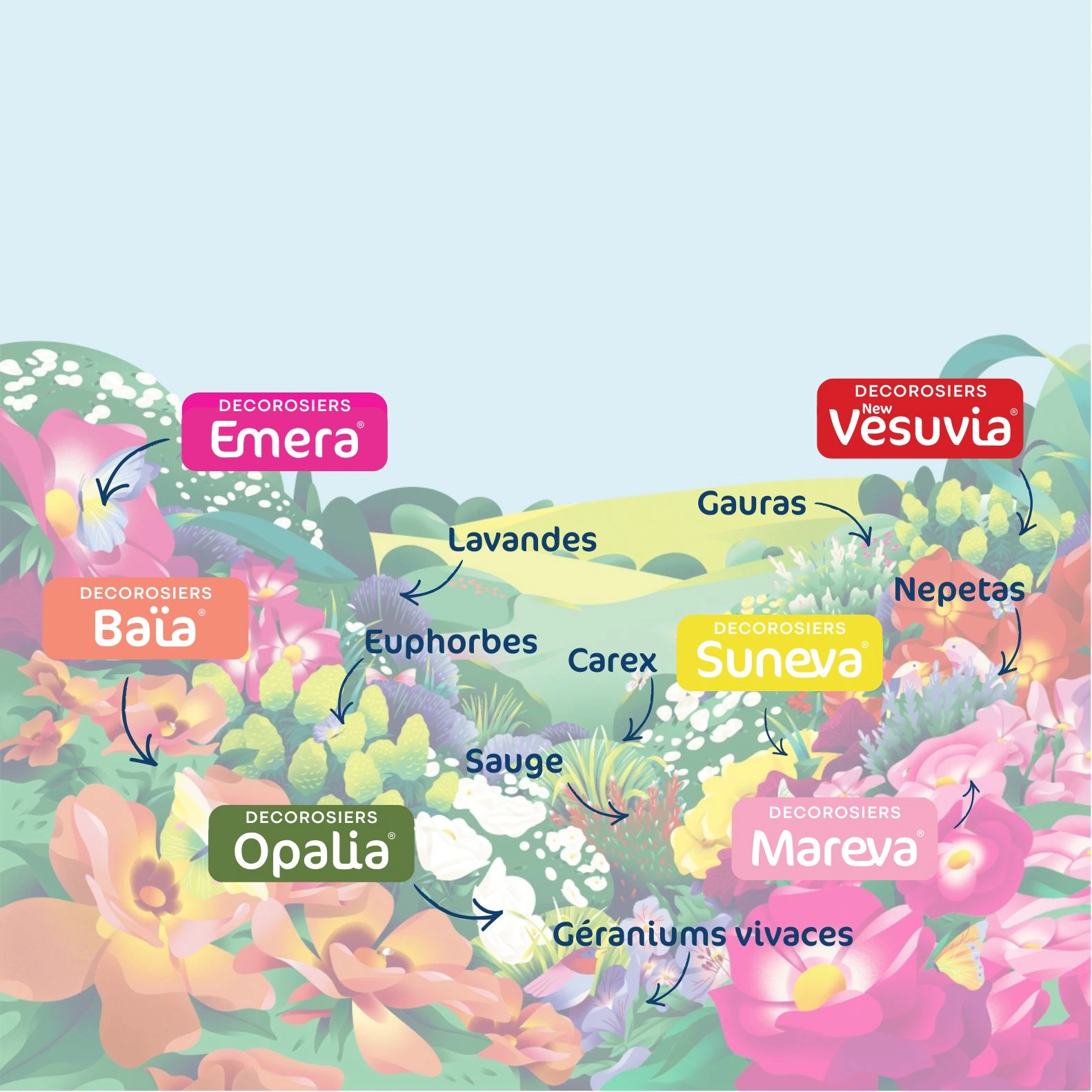 Une représentation créative et colorée d'un jardin composé de DECOROSIERS, de vivaces et de graminées.Des associations simples et faciles pour un jardin 100% plaisir.