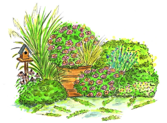 Une scène aux allures champêtres autour du Décorosiers Baïa, une variété au caractère généreux s'épanouissant dans la légèreté des graminées et l'éclat des feuillages contrastés, pour une scène végétale pleine de vie...
