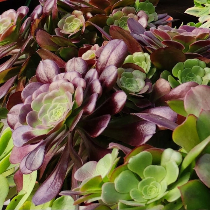 Cette harmonie met en lumière le rouge profond des roses du New Vesuvia, répondant à celui des Crocosmias Lucifer, et des Imperatas Cylindrica Red Baron. La forme emblématique de la rose est évoquée par les rosettes des Aeoniums Velour, dont l’intensité chromatique rappelle celle du Coprosma du premier plan.