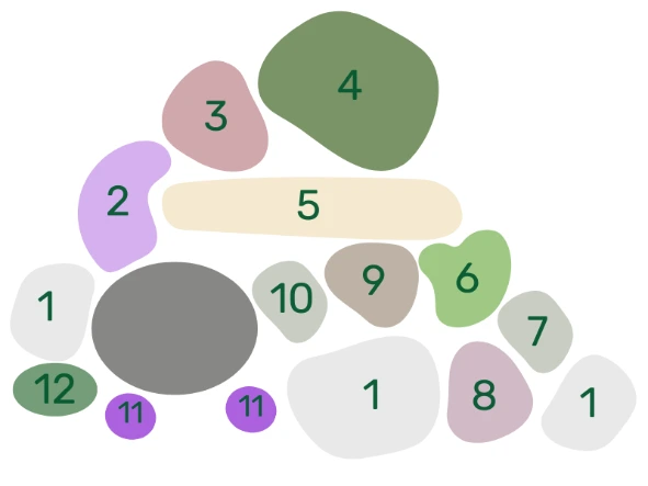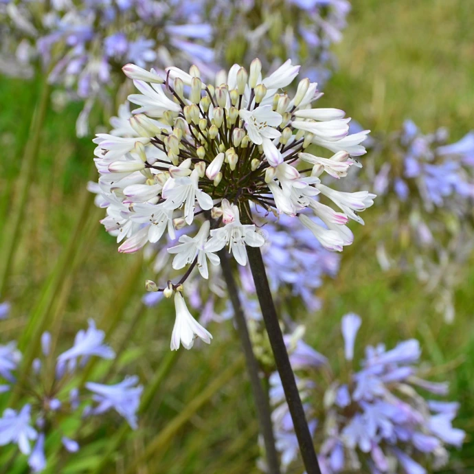 Les Agapanthes et Penstemon apportent une touche aérienne. En contraste, le Phormium et le Pinus mugo offrent des silhouettes fortes et persistantes.